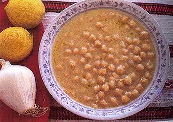Wir legen die Kichererbsen am Vorabend in Wasser und Salz ein, damit sie einweichen. Am naechsten Tag waschen wir sie gruendlich und geben sie in einen Topf, in dem sie mit der Zwiebel geduenstet werden. Nach wenigen Minuten geben wir Wasser, Salz und Pfeffer hinzu und lassen sie weiterkochen. Dann pressen wir die Zitronen aus und vermischen den Saft mit dem Mehl. Wir fuegen die Zitronenmehlseauce, ca. 10 Minuten bevor wir den Topf vom Herd nehmen, dazu.