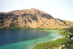 Das tuerkisschimmernde Wasser des cirka 60 m tiefen Sees ist von kristallener Klarheit. Weich und sanft umschmeichelt es die darin Badenden, jeden kleinen Stein am Grund nahe des Ufers koennen sie bei Windstille auch dort noch erkennen, wo Stehen nicht mehr moeglich ist. Und wer da ruecklings im Wasser liegt, sich Sonne auf Bauch und Gesicht scheinen laesst und in die ersten steil ansteigenden Huegel blickt, waehnt sich beileibe nicht am Meer, das ja nur vier Kilometer entfernt ist, sondern inmitten einer Gebirgslandschaft in einer anderen Welt. Hie und da mag da schon eine kleine Wasserschlange (Wuerfelnatter) am Schwimmenden vorbei des Weges ziehen oder ein Verband von Gaensen, der sein Revier abschwimmt und am Ufer ausschreitet, und an den weniger von Menschen frequentierten Uferabschnitten leben sogar noch die Kaspische Wasserschildkroete und Suesswasserkrebse. Entlang des Seeufers fuehrt ein - allerdings nicht durchgehender - Wanderpfad, und wer sich die Muehe macht und entlang der Strasse in Richtung des Dorfes Kournas weitergeht oder -fuehrt, erreicht eine Stelle, an der zugleich der gruenliche See und das blaue Meer ins Blickfeld gerueckt sind.