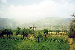 Mit Lassithi verbinden wir auch das Bild der tausenden weissbetuchten Windraeder, welche die Wasserpumpen mit der noetigen Energie versorgten. Wer allerdings gekommen ist, um eine Ebene anzutreffen, auf der diese Windbraeute einem Blumenmeer gleich ausgegossen sind, wie er sich dies womoeglich nach dem Anblick von Fotos aus frueherer Zeit erhofft hat, wird enttaeuscht, denn heute wird das kostbare Wasser unter anderem wegen des sinkenden Grundwasserspiegels groesstenteils mit Hilfe motorbetriebener Pumpen an die Oberflaeche befoerdert und den allermeisten Windraedern sind ihre schoenen Bluetenblaetter abgefallen. Die meisten von ihnen stehen nun nackt in der weiten Ebene, und nur da und dort noch gruesst weisses Tuch denjenigen, der sich nach Vergangenheit sehnt ...
