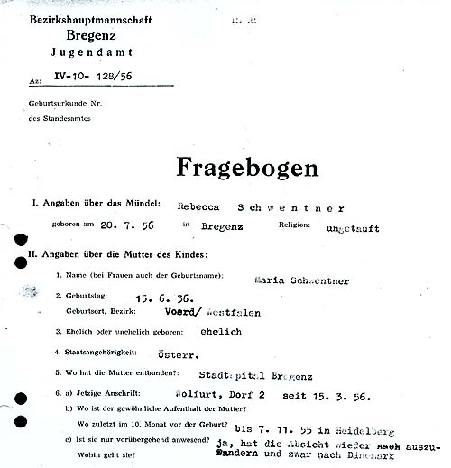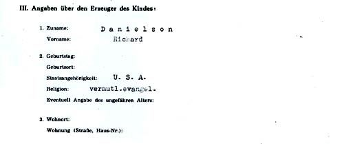 wollen (Sollte mit dieser Mitteilung an die Behoerde lediglich deren Interesse an mir neutralisiert werden?); aus Daenemark, wo sich meine leiblichen Eltern laut Angabe meines leiblichen Vaters im Jahr 1953 kennengelernt hatten, holte sie mein leiblicher Vater Richard M. Danielson naemlich im Sommer 1955 mit einem Heiratsversprechen zu sich nach Heidelberg; dort bewohnten beide bis Anfang November 1955 gemeinsam die Mietwohnung meines leiblichen Vaters bis zu dem Zeitpunkt, als mein leiblicher Vater - ein in Deutschland stationierter US-amerikanischer Besatzungssoldat - seinen Militaerdienst in Deutschland beendete und in seine Heimat USA zurueckkehrte. Ich frage mich auch, weshalb sie mir keine Taufpaten - sie liess mich ja taufen, bevor sie mich verliess, um in die Schweiz arbeiten zu gehen - gegeben hat, und weshalb sie mich nicht krankenversichern liess. |