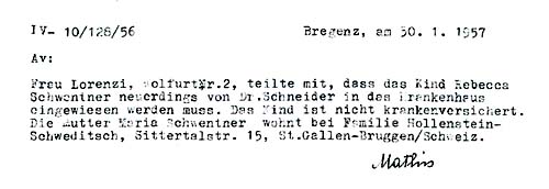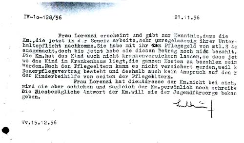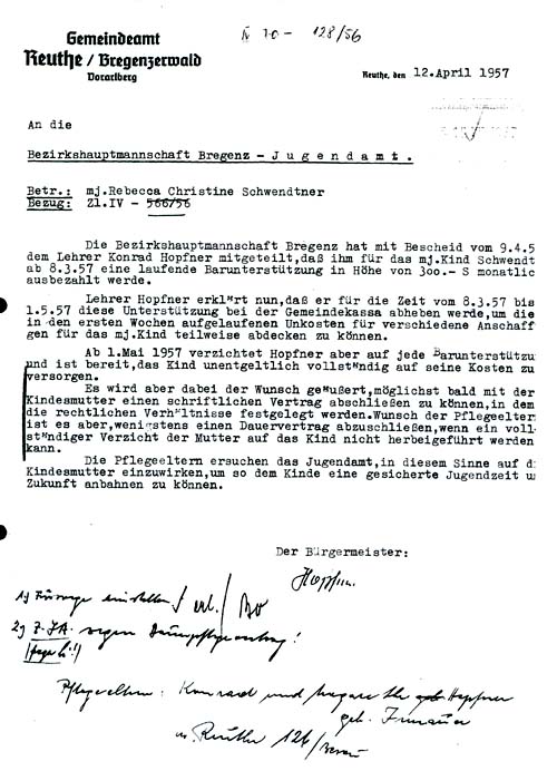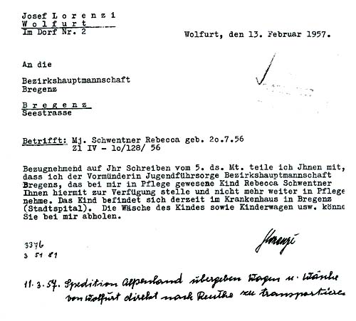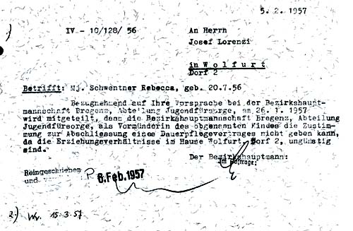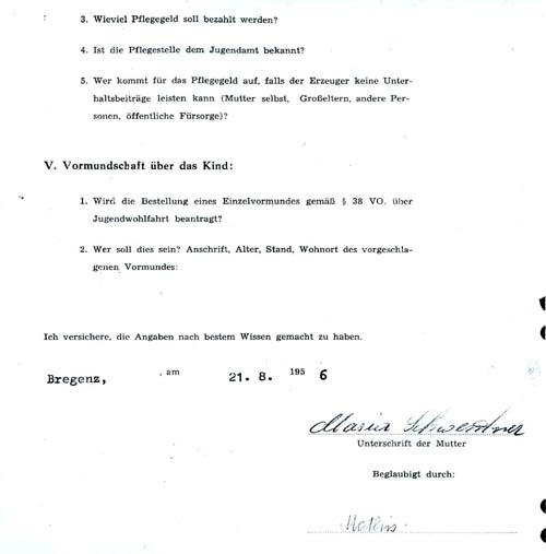 Anmerkung: Bei obigen Dokumenten bzw. Teile von Dokumenten handelt es sich um Niederschriften des Jugendamtes (damals Fuersorge) in Bregenz und um je ein Schreiben meines Pflege"vaters" Josef Lorenzi sowie meines spaeteren (Adoptiv-)Vaters Konrad Hopfner. |
