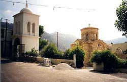 Das Kloster in Myriokefala wurde bereits Anfang des 11. Jhs. vom hl. Ioannis Xenos gegruendet. Mit "liturgischen Geraeten, Buechern und heiligen Bildern", die er aus Konstantinopel mitbrachte, stattete er das Kloster aus, womit hier auch der direkte geistige und kuenstlerische Einfluss von Byzanz auf Kreta dokumentiert ist. Die Klosterkirche, das "Katholikon" befindet sich innerhalb der Klostermauern und wurde als "Kreuzkuppelkirche" erbaut, in ihr sind noch Fresken sowohl aus der ersten Phase (11.Jh.) als auch aus der zweiten Phase (13. Jh.) ihrer kuenstlerischen Realisierung in relativ gutem Zustand erhalten. Zum Zeitpunkt meines Besuches waren gerade umfangreiche Renovierungsarbeiten im Gang, deren Ziel die umfassende und dauerhafte Konservierung des kuenstlerischen und historischen Gutes war.