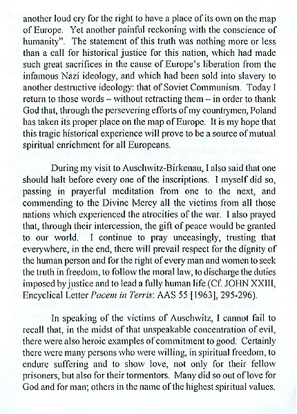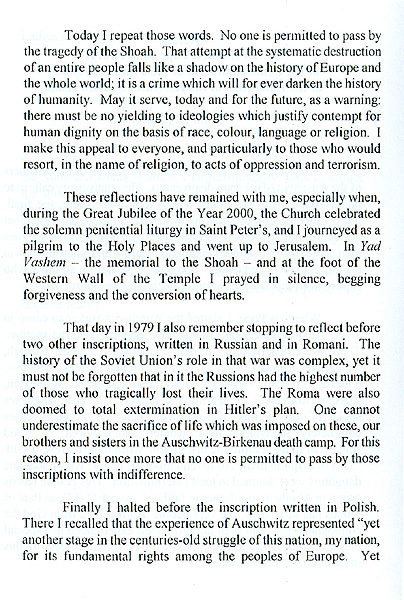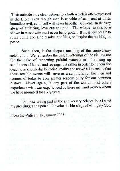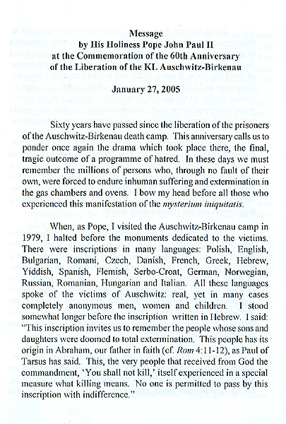 Anmerkung: Der Text und seine formale Praesentation wurden dem Programmheft zur Feierlichkeit am 27. Januar 2005 in Auschwitz-Birkenau entnommen.