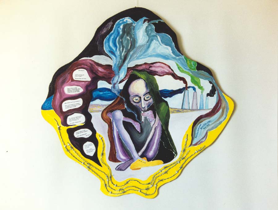 Stan Zak Kaminski - Muselmann Nach einem Foto, das der Kuenstler - Stan Zak Kaminski ist juedisch-polnischer Auschwitz-Ueberlebender - mir ueberlassen hat. Inspiriert zu dieser Arbeit wurde der Kuenstler durch den Gedichtband "Dein Antlitz schwarzer Rauch am Himmel. Dem Muselmann", aus welchem Textteile in das Gemaelde von ihm eingearbeitet wurden. M.R. Hecht Hopfner. Wien. 2003-2023. Alle Rechte vorbehalten. |